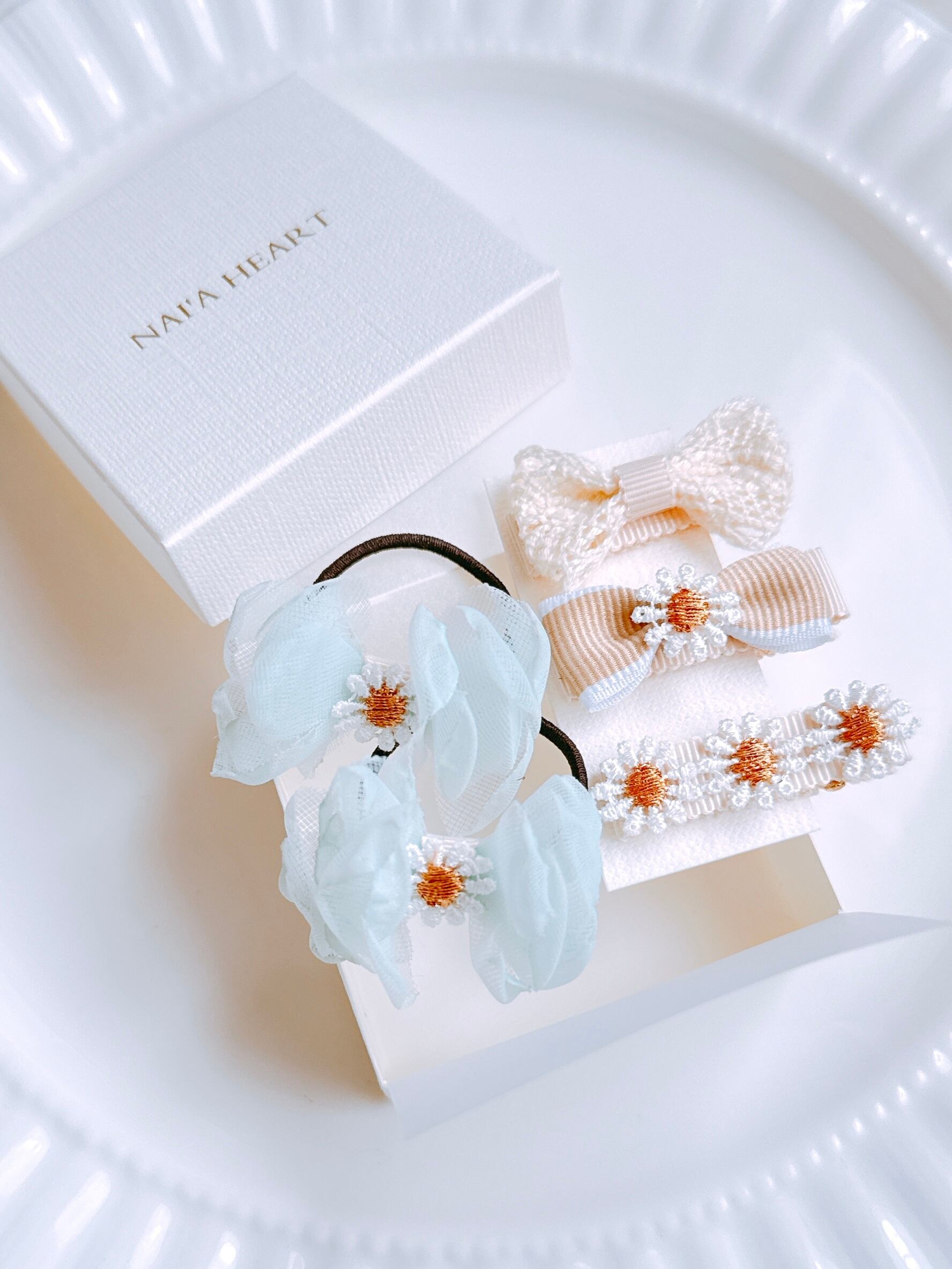 赤ちゃんからお使いいただける、やさしい素材で仕上げたヘアアクセサリーセットをご紹介します。