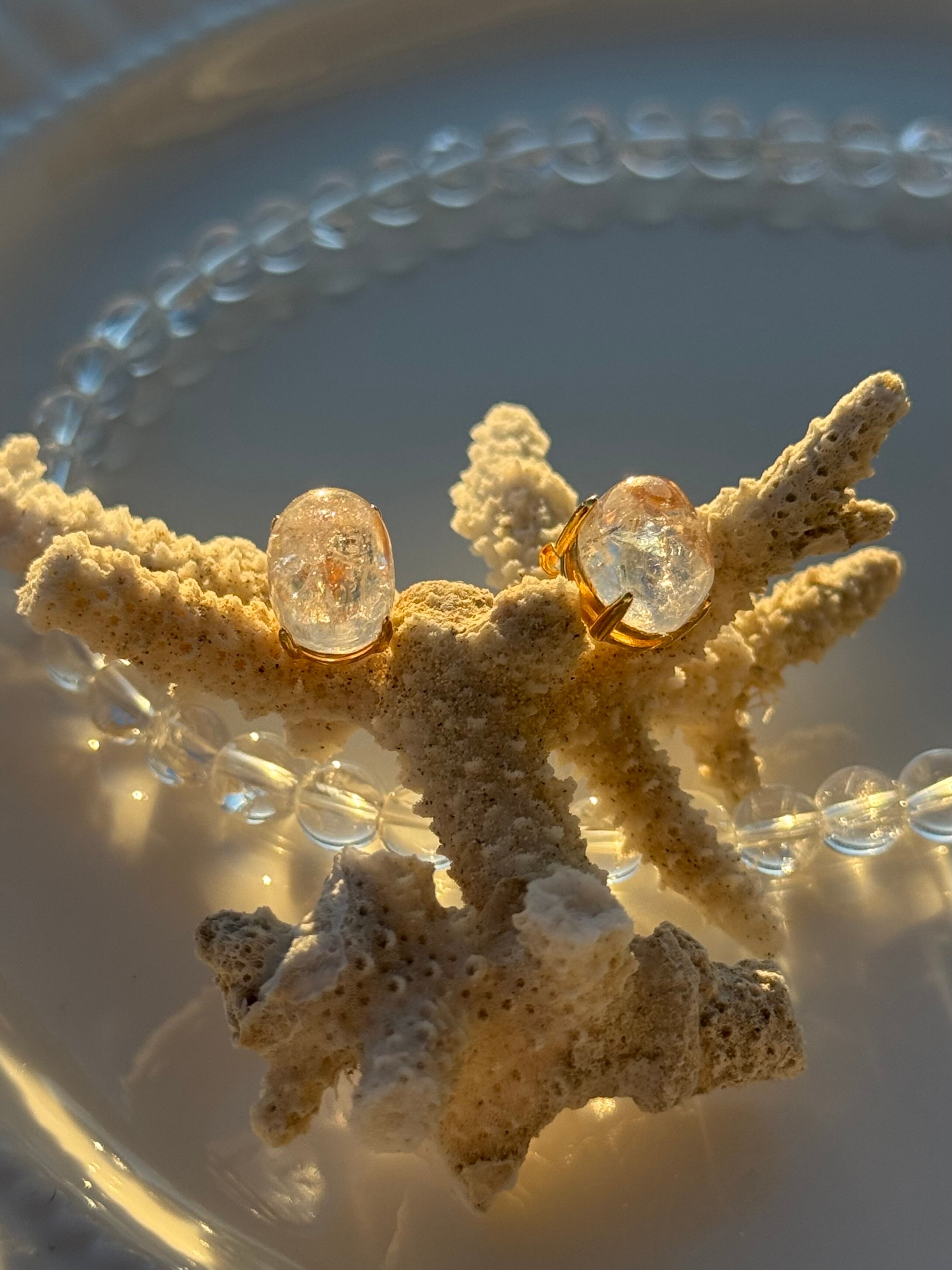 こちらの商品は、美しいアイリークオーツを使用した天然石ピアスとなります。クォーツの透明度が高く、クラック部分に見える虹色の輝きが魅力の天然石です。